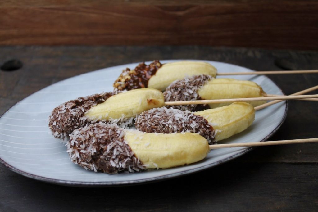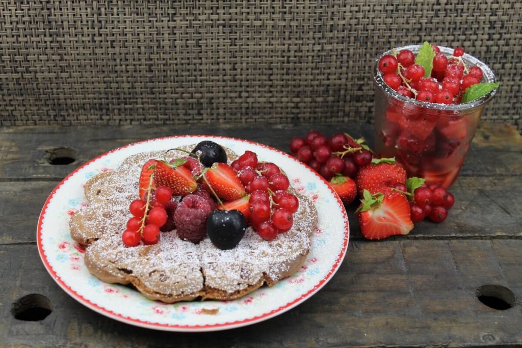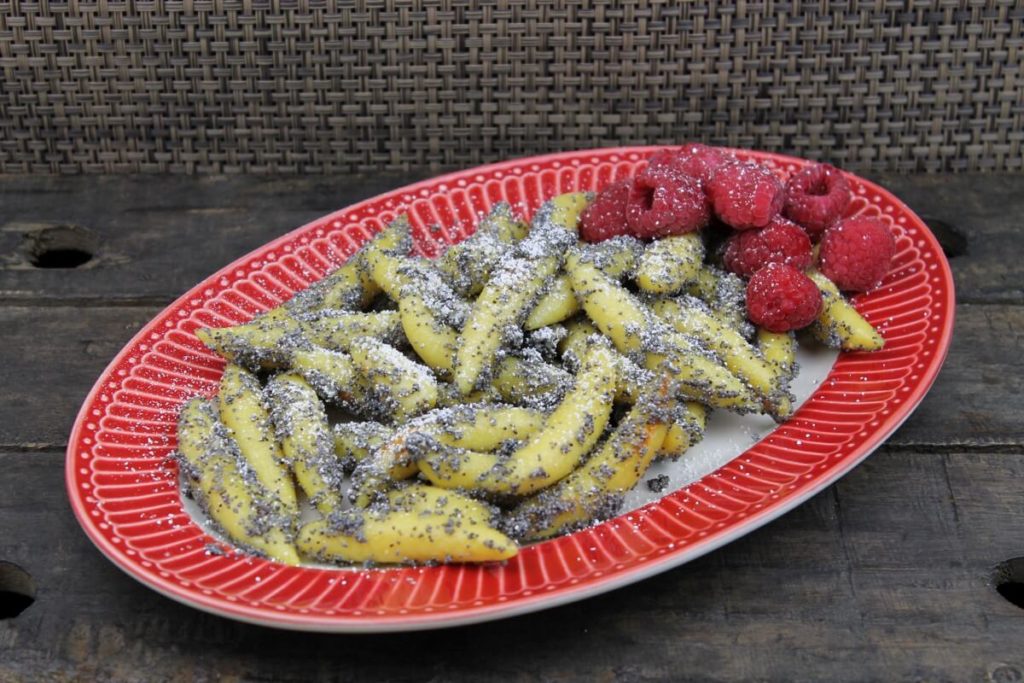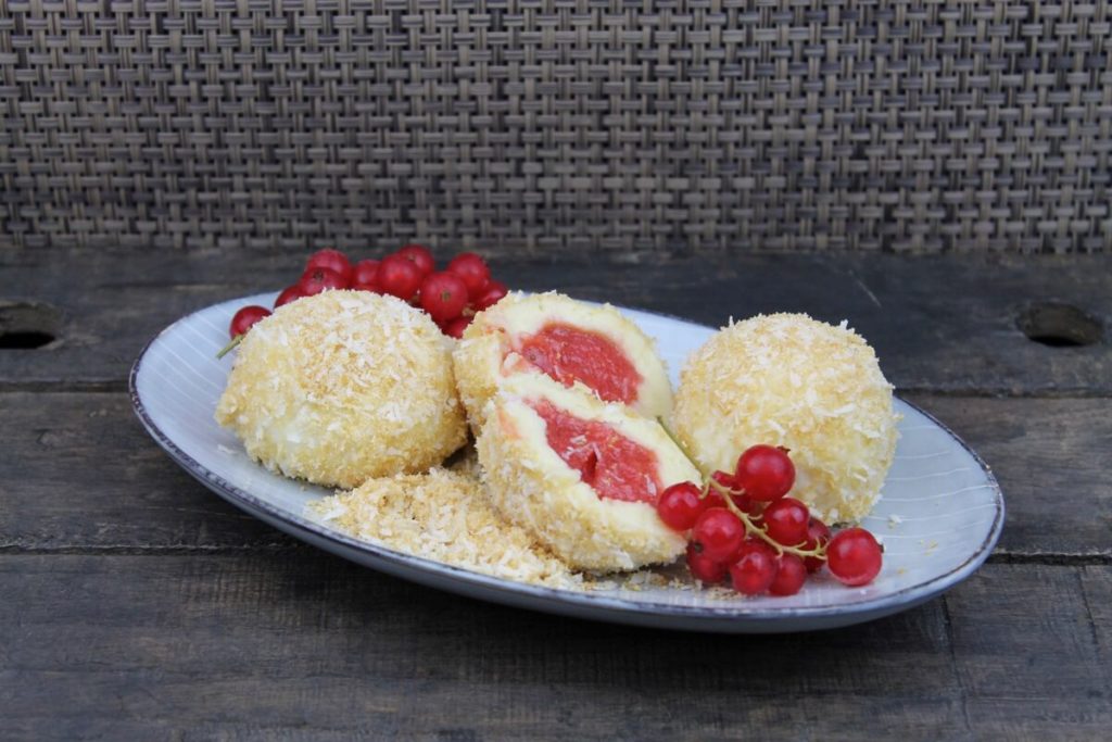 Erdbeer-Ribiselknödel mit Kokosflocken