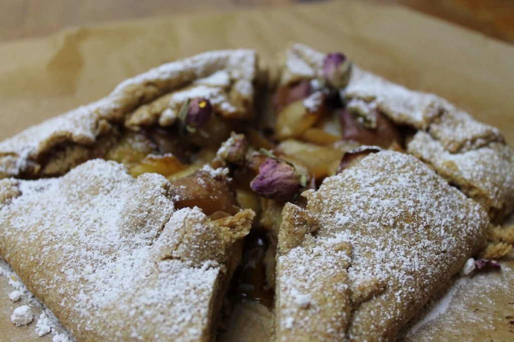 Dinkelplunder mit Salted Karamellpfirsich und Rosenknospen