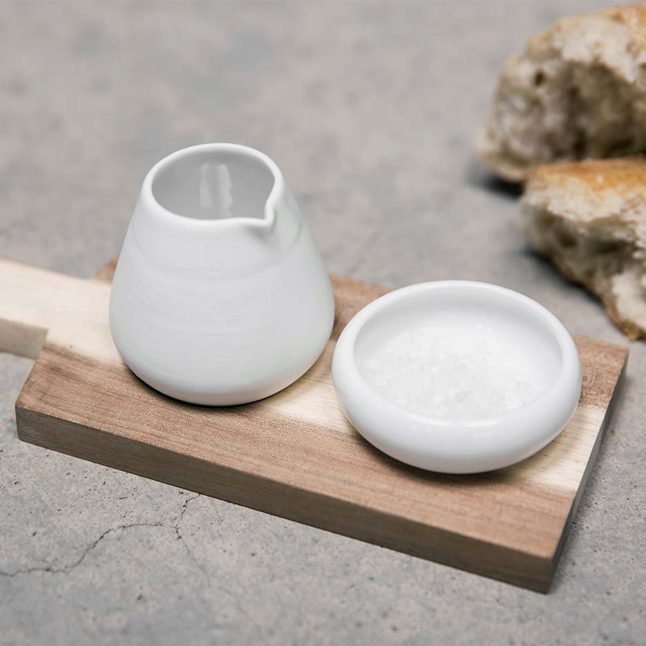Porzellan, glasiert und unglasiert, Frettchen aus unbehandeltem Akazienholz