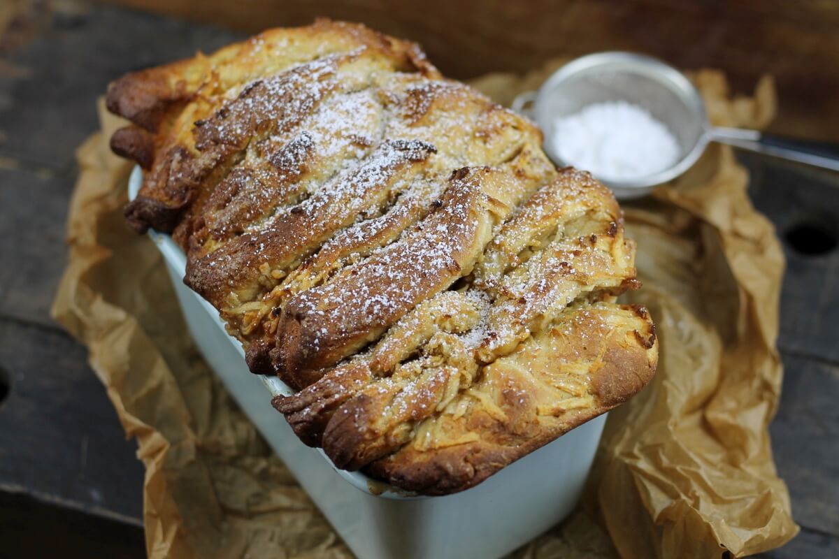 Milch erwärmen, aber nicht kochen lassen. Hefe und Zucker in ein Gefäß geben und mit der lauwarmen Milch vermischen. Mehl und Ei in eine Schüssel geben, Hefe-Zuckergemisch zufügen und kneten. Die geschmolzen Butter untermischen und zu einem geschmeidigen Teig kneten. An einem warmen Ort zugedeckt für 1 Stunde gehen lassen. Auf einer bemehlten Arbeitsplatte zu einem Rechteck ausrollen. Zucker,Zimt und geschmolzene Butter vermischen und auf dem Teig verteilen. Apfel grob raspeln und ebenfalls darüberstreuen. Teig in Streifen schneiden, dann in Quadrate die in die Form passen. Stück für Stück hintereinander schlichten. Bei 165 Grad Heißluft für 35-45 min backen.