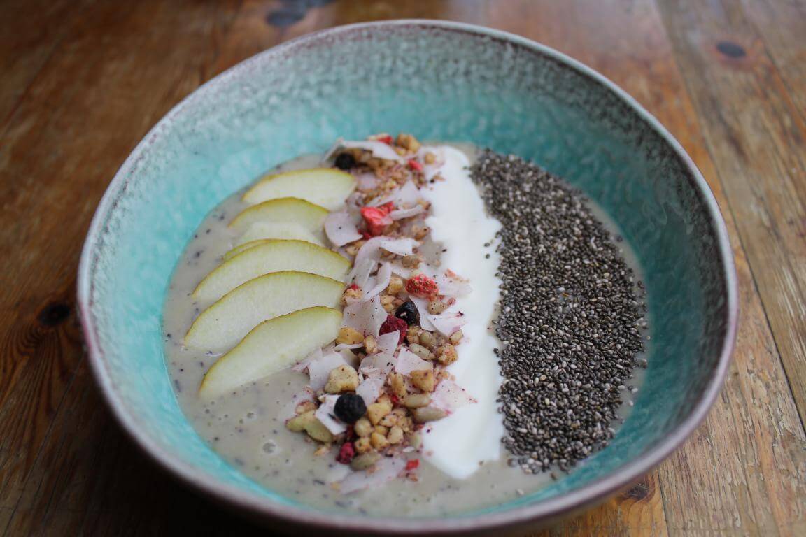 Die Beeren mit dem Joghurt, Minze und dem Kokosblütenzuckern cremig mixen. In eine Schüssel geben und mit Chiasamen, Müsli und Birnenscheiben garnieren.