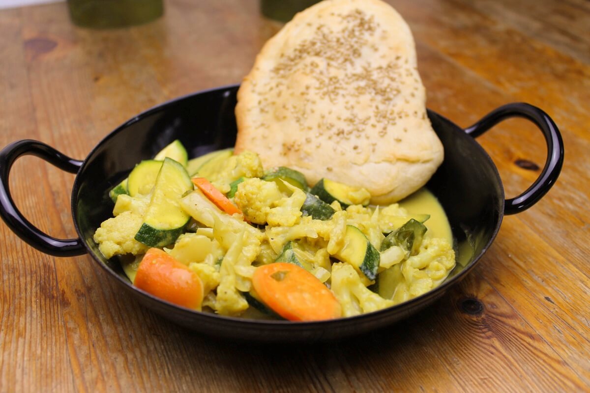 Die Hefe mit lauwarmem Wasser anrühren. Unter Rühren das Mehl mit einer Prise Salz zufügen, und mit einer Küchenmaschine zu einem geschmeidigen Teig rühren. In einer Schüssel zugedeckt an einem warmen Ort ca. 30 min gehen lassen. Auf einer mit Mehl bestreuten Arbeitsfläche kurz durchkneten und zu Pitabroten formen. Mit Olivenöl bepinseln, mit Sesam bestreuen. Bei 180 Grad 20 – 25 min backen.Den Blumenkohl in kleine Röschen teilen und in etwas Salzwasser bissfest garen. Zucchini in Scheiben schneiden und gemeinsam mit der Schalotte, ebenfalls in Scheiben geschnitten, anbraten. Den Blumenkohl abseihen und ebenfalls mit anrösten. Karotten schälen und schneiden. Das Gemüse mit Kokosmilch ablöschen und die Karotte hinzufügen. Mit Salz, Pfeffer, Bananencurry, Kurkuma und Gemüsebrühe gut würzen. Das Curry etwas ziehen lassen und bei Bedarf nachwürzen. Gemeinsam mit Pitabrot servieren.