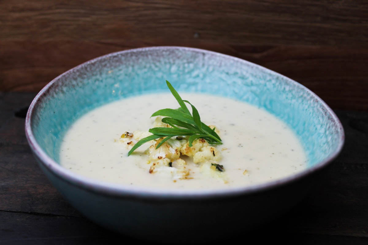 Zwiebel und Blumenkohl hacken. In einem Topf anrösten und 2 – 3 EL zur Seite geben. Den Rest mit Milch und Brühe aufgießen. Blumenkohl weichkochen und pürieren. Mit Salz, Pfeffer, Liebstöckel und Zitronensaft würzen. Mit Sahne verfeinern und nochmal kurz pürieren. Estragon hacken und mit dem übrigen Blumenkohl und Zucker anrösten bis er schön braun ist. Die Suppe bei Bedarf nachwürzen und mit dem gerösteten Estragon-Blumenkohlgemisch bestreuen. Frischen Pfeffer darüber und servieren.