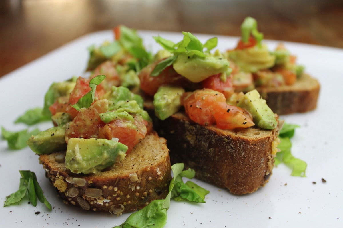 Vollkornbaguette in Scheiben schneiden und mit Olivenöl bestreichen. Bei 180 Grad 5 – 10 Minuten im Backrohr kross backen. Avocado-Tomatengemisch auf die Brote geben und mit Basilikum bestreuen.