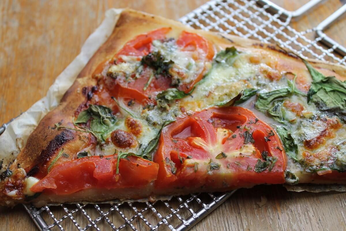 Den Teig auf ein Backblech geben. Mit passierten Tomaten gut bestreichen. Die Zwiebel in Ringe schneiden und belegen. Tomaten ebenfalls in Scheiben und über den gesamten Teig verteilen.Etwas Salz, Pfeffer und Kräuter darüberstreuen. Mozzarella würfelig schneiden und gemeinsam mit dem Blattspinat auf die Pizza geben. Zum Schluß den Gorgonzola je nach Belieben zerkrümeln und die Pizza damit garnieren. Je nach Teig 20 – 30 min goldbraun backen.