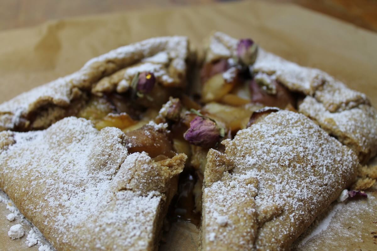 Dieser Teig geht einfach und rasch. So muß man ihn aber auch verarbeiten. Das Mehl in eine Schüssel geben. Salz, Zucker und Butter in Stücken zufügen. Die Hände mit kaltem Wasser abspülen, abtrocknen und sofort zu einem Teig verkneten. 3 – 4 EL Eiswasser zufügen und gut vermengen. Den Teig zu einer Kugel formen und für ca. 30 min in den Kühlschrank legen. 2 Blatt Backpapier auf eine Arbeitsfläche legen und den Teig dazwischen ausrollen. In einer Pfanne den braunen Zucker schmelzen lassen und die Pfirsiche in Scheiben geschnitten zufügen. Rosenknospen und Salz dazu, alles gut schmoren und ziehen lassen. Die Masse in die Mitte des Teigs leeren und an vier Seiten einfach hochklappen und sicherstellen das er gut schließt seitlich. Bei 200 Grad Heißluft ca. 30 – 35 min backen. Mit Puderzucker bestreuen und am Besten lauwarm genießen.