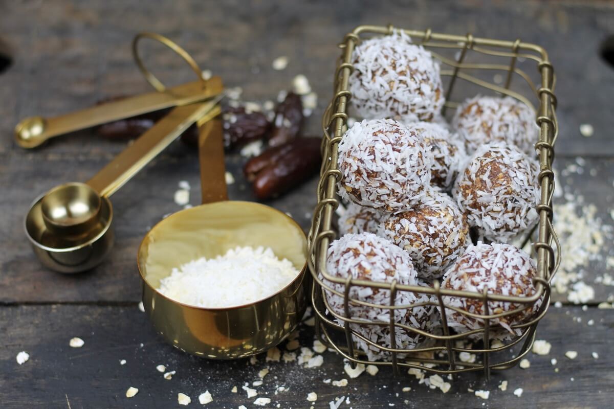 Die Orange auspressen und Schale abreiben. Datteln und Mandeln in einer Küchenmaschine auf höchster Stufe mixen. Haferflocken, Orangensaft und alle restlichen Zutaten zufügen und nochmals gut mixen bis die Masse sehr klebrig ist. Mit feuchten Händen zu Kugeln formen, in Kokosflocken wälzen. Im Kühlschrank aufbewahren.