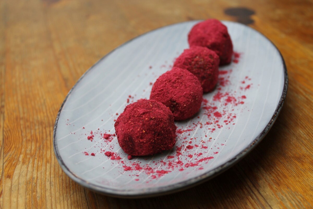 Orange pressen und Schale abreiben. Haferflocken mit Saft vermengen. Datteln halbieren und mit Mandeln in einem Blitzhacker zerkleinern. Kokosblütenzucker, 1 EL Himbeerpulver und Mandelmus zufügen. Kugeln formen und in Himbeerpulver wälzen. Am Besten etwas gekühlt servieren.