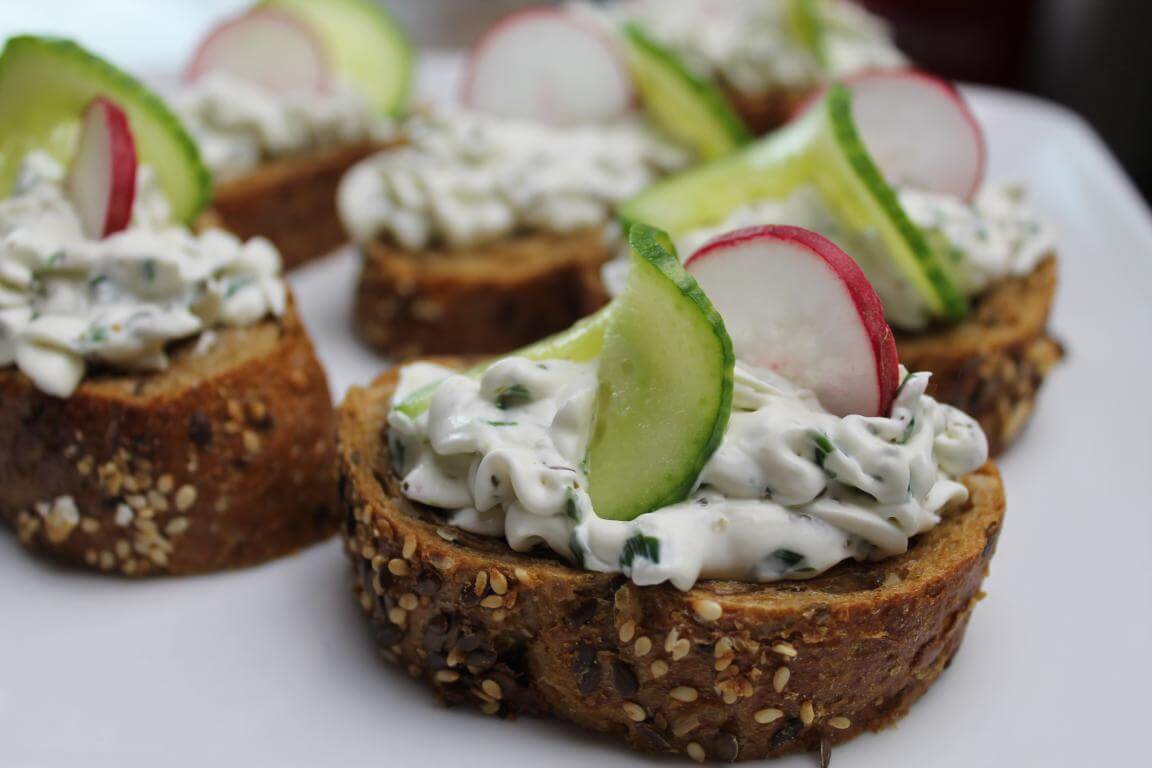 Mit einem Dressiersack auf Brotscheiben aufspritzen und mit Gemüse garnieren.