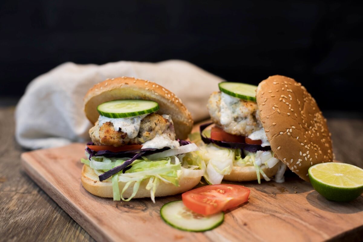 Die Burger Buns nach Anleitung backen. Die Unterseite mit der Mayonnaise bestreichen. Mit Salat, Gurke und Tomaten belegen. Fisch Patty oben drauf. Wer möchte kann noch mit Sauce toppen.