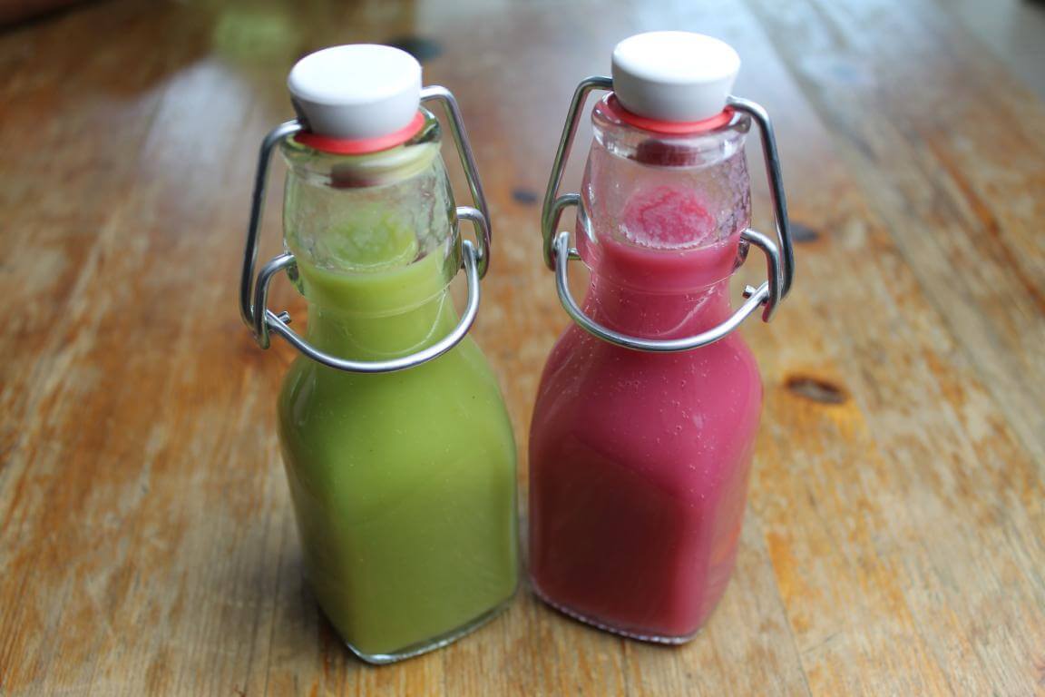 Bei beiden Smoothies alle Zutaten in einen Mixer oder Smoothiemaker. Cremig pürieren und bei Bedarf etwas Wasser zufügen.