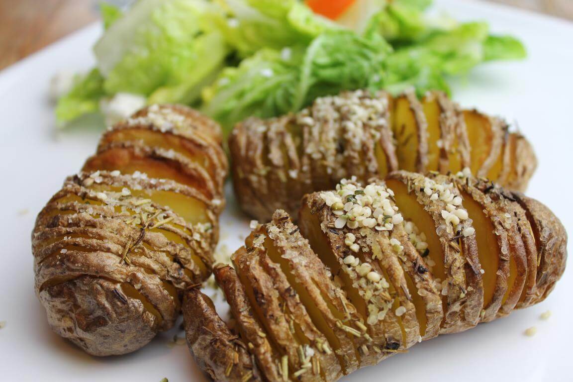 Die Kartoffeln so tief wie möglich einschneiden, ohne sie ganz durchzuschneiden. In einer Schüssel mit Olivenöl, Meersalz und Rosmarin schwenken. Auf ein Backblech mit Backpapier geben und bei 200 Grad Heißluft ja nach Größe ca. 30 min ganz knusprig backen. Für den Salat alle Zutaten mit einem Schneebesen zu einer Vinaigrette verrühren und über den Salat geben. Zum Schluss die Kartoffeln mit Hanfsamen oder gerösteten gemahlenen Haselnüssen bestreuen.