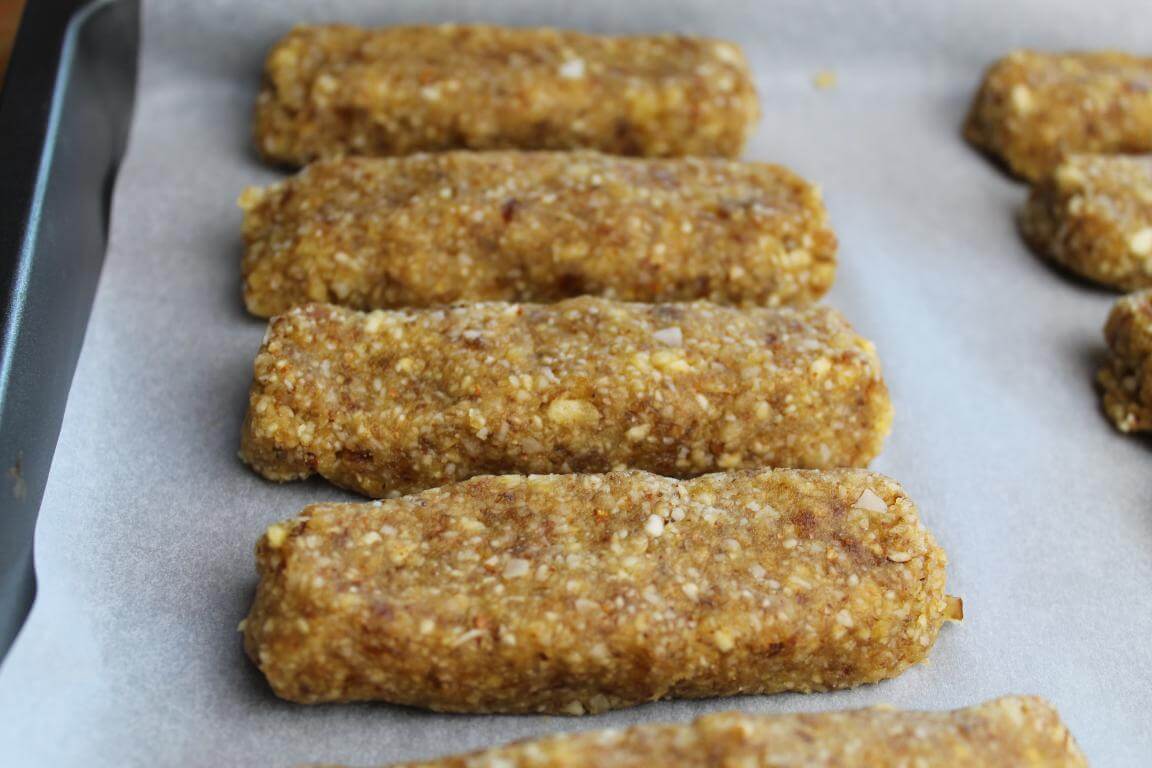 Bananenchips und Datteln grob hacken, dann mit allen anderen Zutaten in eine Küchenmaschine und hacken. Bei Bedarf Honig zufügen. In Müsliriegelform bringen und in den Kühlschrank geben. Ich bewahre sie in einer Plastikbox ca. 1 Woche im Kühlschrank auf.
