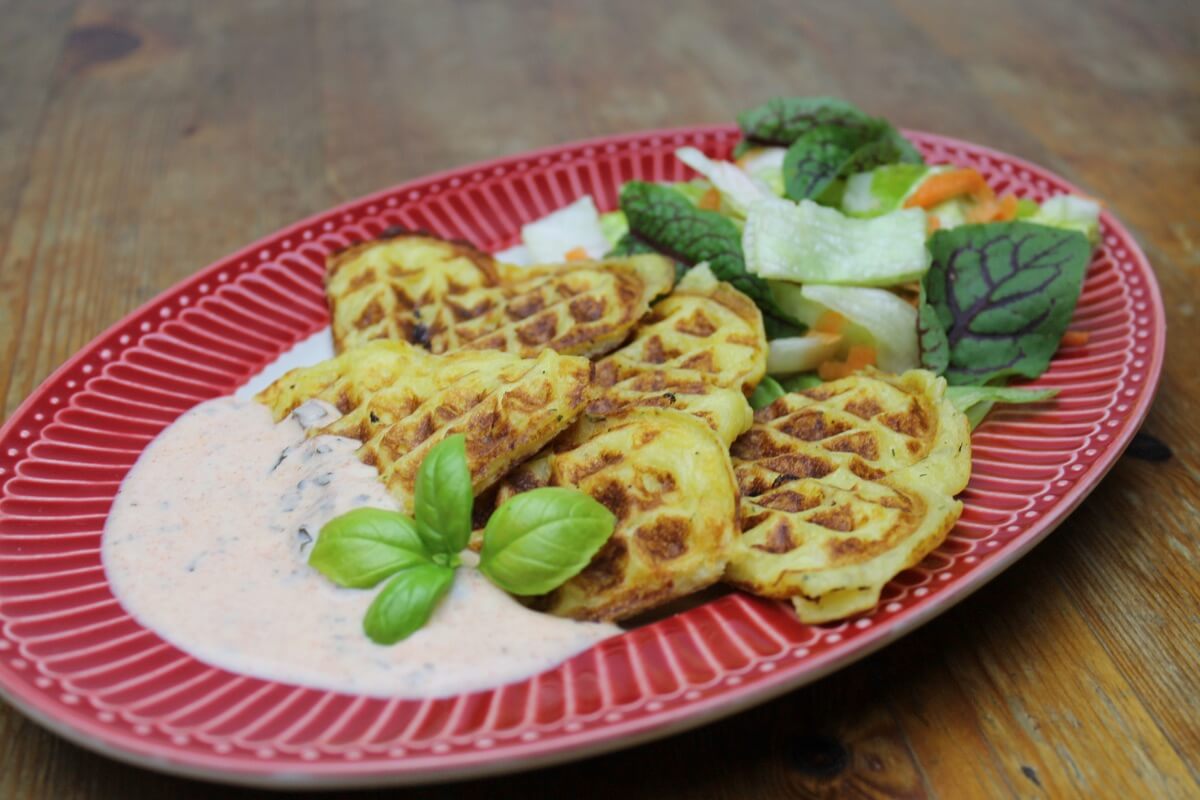 Die Kartoffeln schälen, klein schneiden und in Salzwasser weich kochen. Etwas abkühlen lassen und mit einer Kartoffelpresse in eine große Schüssel pressen. Olivenöl, Eier, Stärke, Backpulver,Muskat und mit einer, in kleine Stücke geschnittene Zwiebel, zu einem glatten Teig vermischen. Je nach Belieben etwas Kräuter in den Teig mischen. Das Waffeleisen mit etwas Öl bestreichen. 2 – 3 EL Teig darauf verteilen und die Waffeln ca. 4 – 5 min backen. Im Backrohr warmstellen.