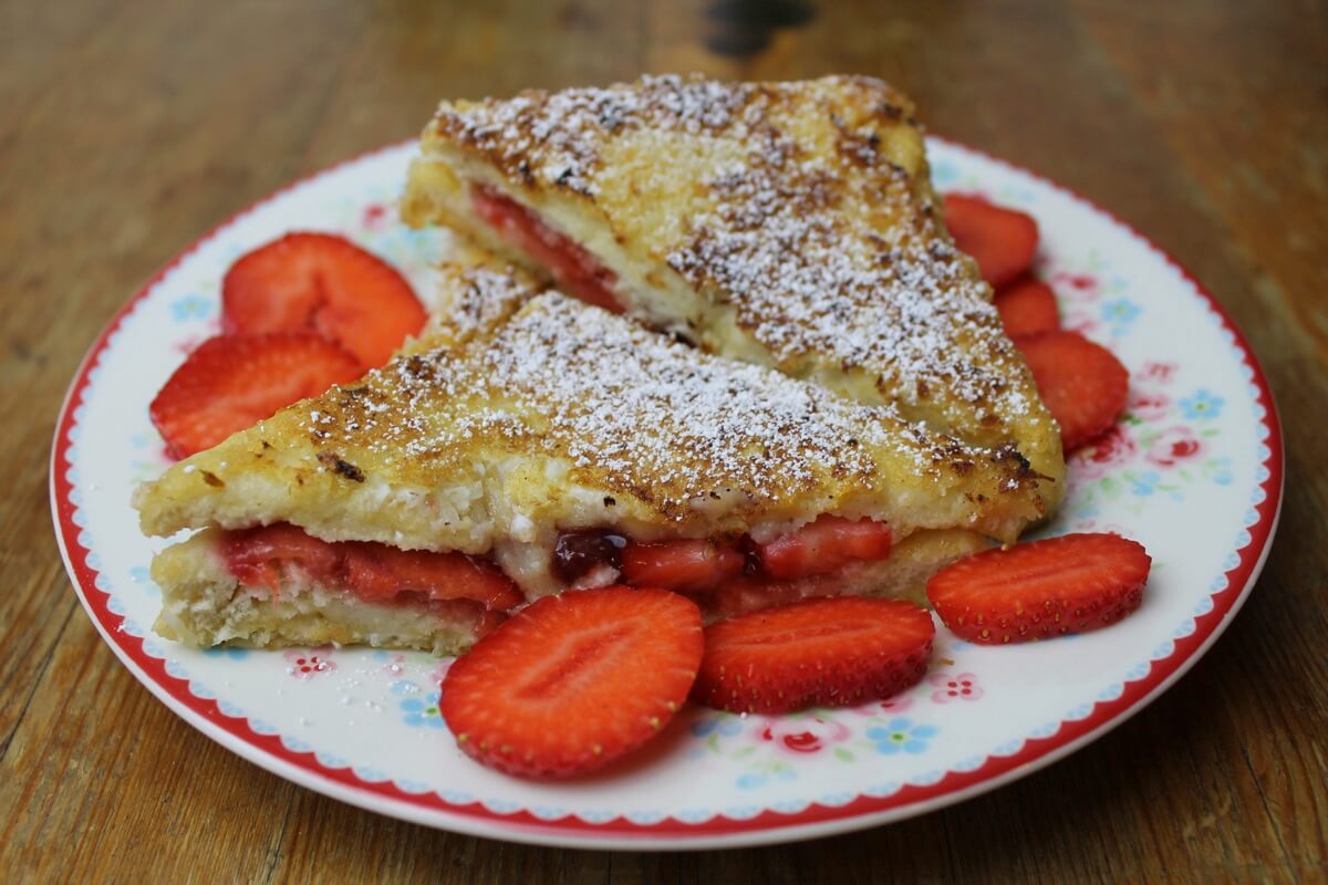 Dinkeltoastscheiben mit jeweils 1 TL Erdbeermarmelade bestreichen und mit Erdbeerscheiben belegen. Die leere Scheibe darauf und zuerst in Milch/Kokosgemisch gut eintunken damit alle Seiten gut getränkt sind , dann im Ei komplett durchziehen. Zuletzt in Kokosflocken wälzen und festdrücken. In etwas Margarine oder Butter braten. Mit Puderzucker bestreuen.