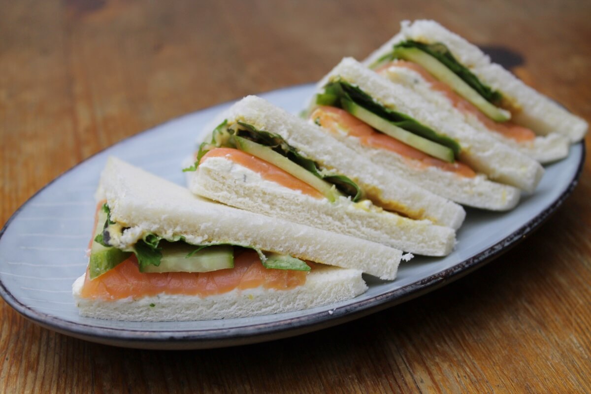 Eine Hälfte mit Senf, die andere Hälfte mit Frischkäse bestreichen. Dill darüberstreuen. Lachs und Gurken auf das Brot legen, und mit Salat garnieren. 2 Mal als Dreieck durchschneiden. FERTIG