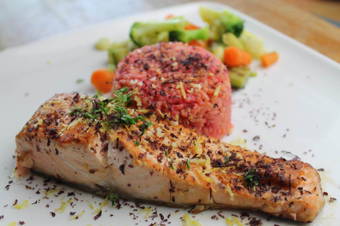 Das Gemüse bissfest kochen. Den Lachs mit Gemüse und Reis anrichten und mit Algenflocken bestreuen.