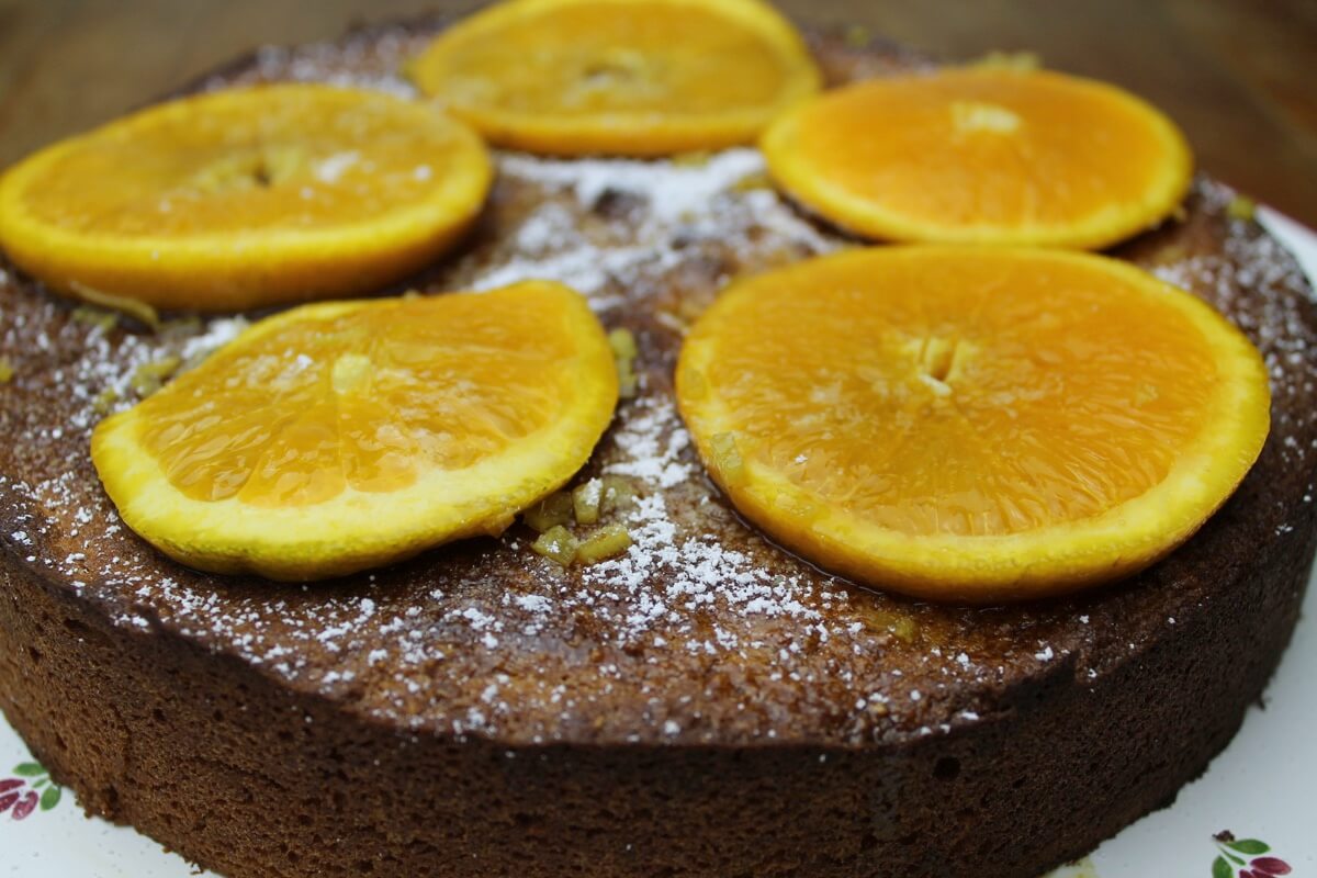 Den braunen Zucker mit 50 ml Wasser aufkochen. Den geschälten und gehackten Ingwer zufügen. Die Orange zum Garnieren in Scheiben schneiden und kurz mitkochen. Den Kuchen damit belegen und mit dem Sirup beträufeln. Mit Staubzucker bestreuen.