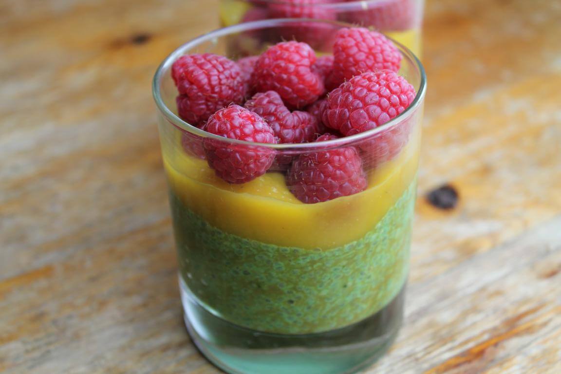 200 ml Milch mit Zucker aufkochen. Vom Herd nehmen und das Matchapulver mit einem Schneebesen einrühren. Die Chiasamen hinzufügen und gut durchrühren, bis die Masse etwas andickt. In Gläser füllen, abkühlen lassen und dann in den Kühlschrank stellen. Mit Apfelmangomus auffüllen und mit Himbeeren garnieren.