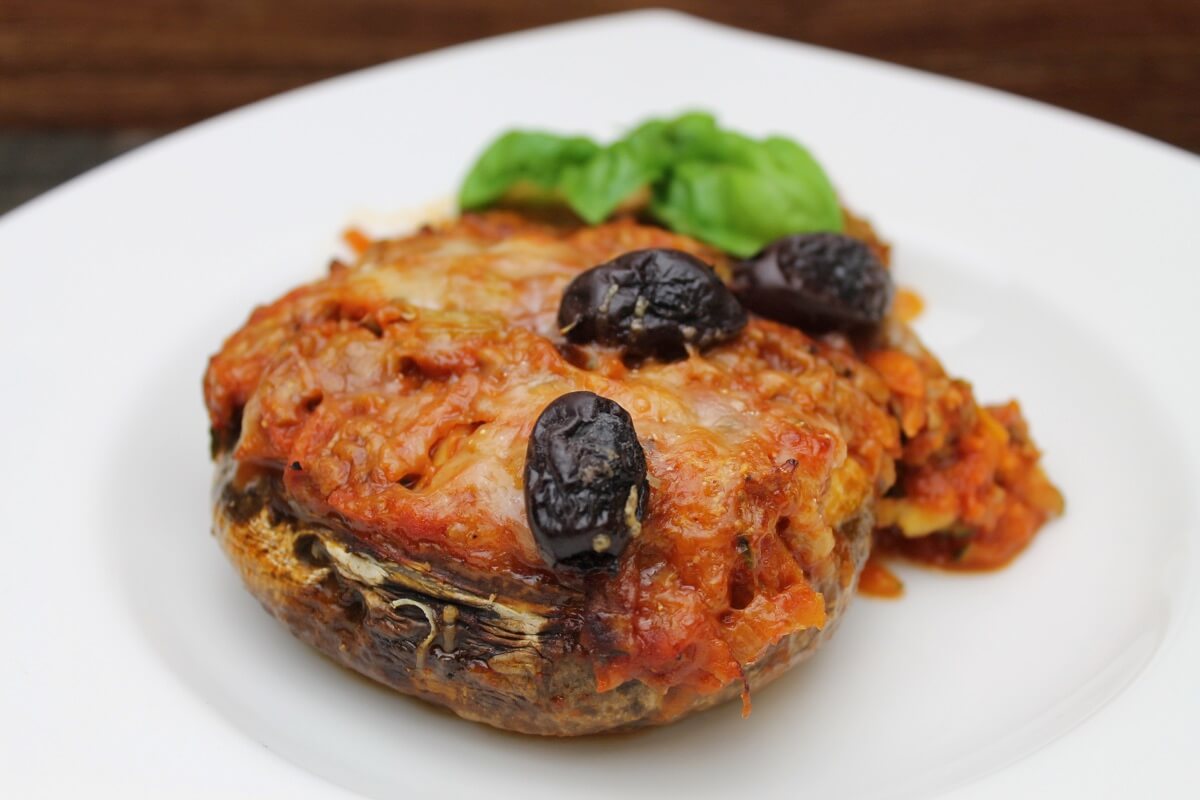 Portobellopilze vom Stiel befreien und in eine Auflaufform legen. Zwiebel, Knoblauch und Hackfleisch in einer Pfanne gut anrösten. Mit Salz, Pfeffer und Rinderbrühe würzen. Karotten, Zucchini und Sellerie untermischen und ebenfalls mitbraten. Aufgießen mit passierten Tomaten und mind. 15 – 20 min leicht köcheln lassen. Die Kräuter zufügen, nochmal abschmecken und wieder 15 min leicht köchelnd ziehen lassen. Die Pilze mit der Hack-Gemüsemischung befüllen und mit Parmesan bestreuen. Die Oliven zugeben und das Ganze bei 170 Grad 30 min backen. Mit grünem Salat servieren.