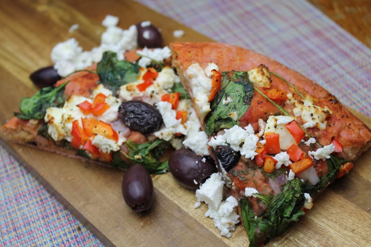 Für den Teig das Mehl in eine große Schüssel geben. Die Zwiebel mit Olivenöl anrösten und kurz abkühlen lassen. Zucker, Wasser,Zwiebel, Rote Beetepulver und Hefe zufügen und zu einem glatten Teig rühren. An einem warmen Ort gehen lassen. Mehl auf die Arbeitsplatte sieben und den Teig nochmals durchkneten. Auf ein mit Backpapier ausgelegtes Backblech legen und in Form ziehen. Knoblauch, Salz und Olivenöl verrühren und den Teig damit bepinseln. Passierte Tomaten mit einem Löffel darauf verstreichen. Zwiebel in Scheiben schneiden und ebenfalls darüber verteilen. Mit Salz, Pfeffer und italienischen Kräutern würzen. Mit Paprikawürfel, Spinat, Oliven und Feta fertig belegen, und bei 180 Grad ca. 25 min backen.