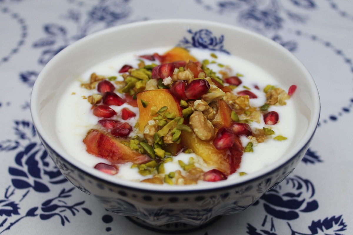 Pfirsich waschen und in Spalten schneiden. In einer Pfanne mit Zucker und Ahornsirup rösten und weich köcheln. Joghurt in eine Schüssel geben. Pfirsiche noch warm zum Joghurt fügen. Mit Nüssen, Pistazien und Granatapfel bestreuen. Zum Schluss mit Ahornsirup beträufeln.