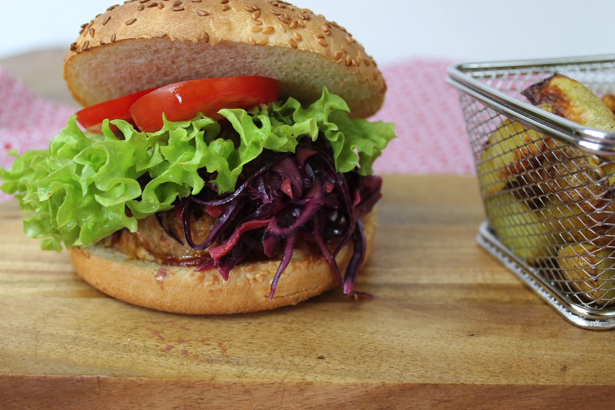 Den Rotkohl etwas durchkneten, damit er weicher wird. Karotten zufügen und mit den restlichen Zutaten zu einem Salat verrühren. Die Zwiebeln in Ringe schneiden und mit etwas Wasser und Zucker karamellisieren lassen.