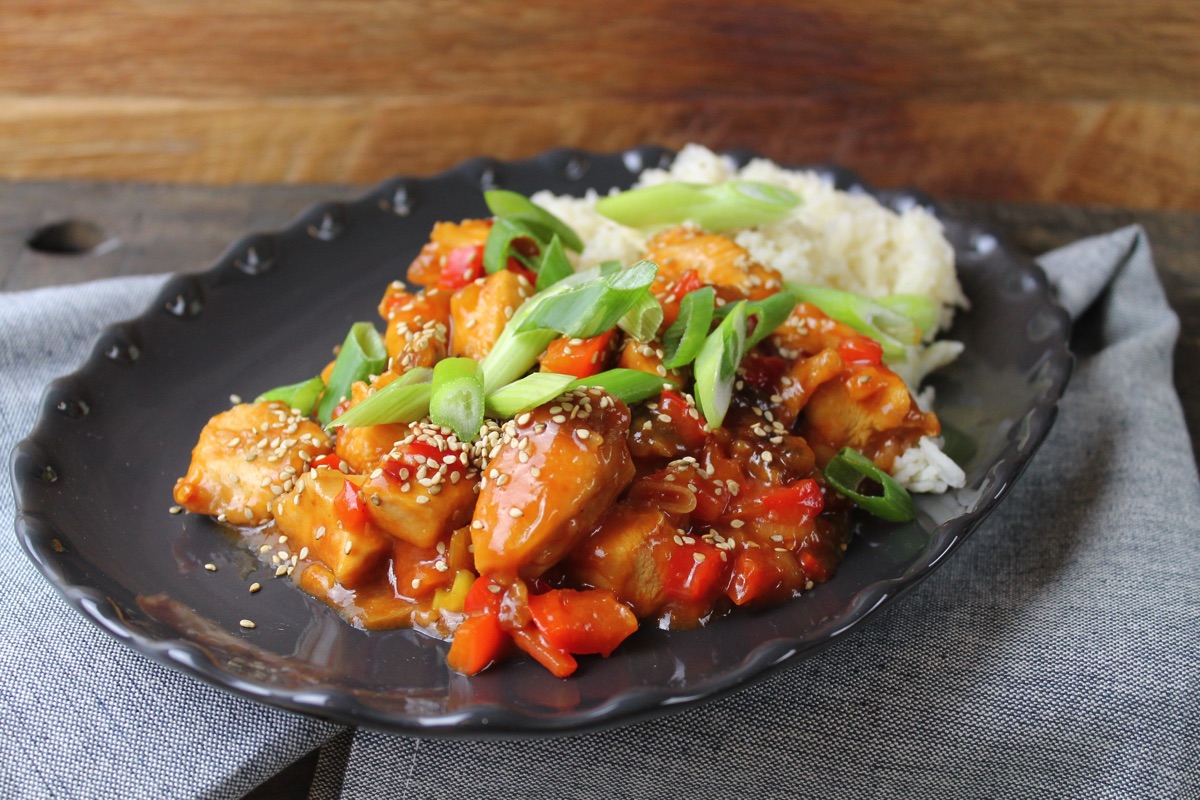 Fleisch klein schneiden und in eine Schüssel mit Deckel geben. Stärke, Zucker und Sojasauce zufügen, Deckel schließen und kräftig schütteln. Paprika würfeln und Frühlingszwiebel in Ringe schneiden. Das Grün der Zwiebel beiseite legen. Ketchup, 4 EL Wasser, Sambal Oleg, Honig und Essig verrühren. Ingwer und Knoblauch klein schneiden. Das Fleisch in einer Pfanne kräftig anrösten, dann aus der Pfanne nehmen. Zwiebel und Paprika rösten und mit der Ketchupmischung ablöschen. Fleisch zufügen und alles auf kleiner Flamme zugedeckt köcheln lassen. Mit Salz und Pfeffer abschmecken. Den Sesam ohne Fett rösten. Hähnchen mit Reis servieren, mit Grün von den Frühlingszwiebel und dem Sesam garnieren.