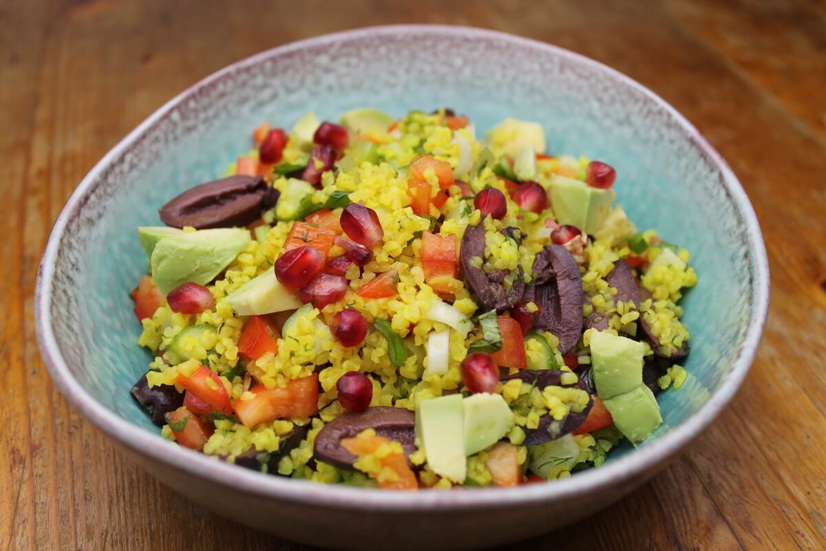 Bulgur abspülen und nach Packungsanweisung mit Kurkuma kochen. Gurke, Paprika und Frühlingszwiebel klein schneiden. Kräuter hacken und Oliven halbieren. Bulgur mit allen Zutaten vermischen. Mit Kräuter und Gewürzen vermengen. Granatapfelkerne und Avocado als Topping verwenden. Den Salat etwas durchziehen lassen und bei Bedarf mit Chili und Zitronensaft nachwürzen.