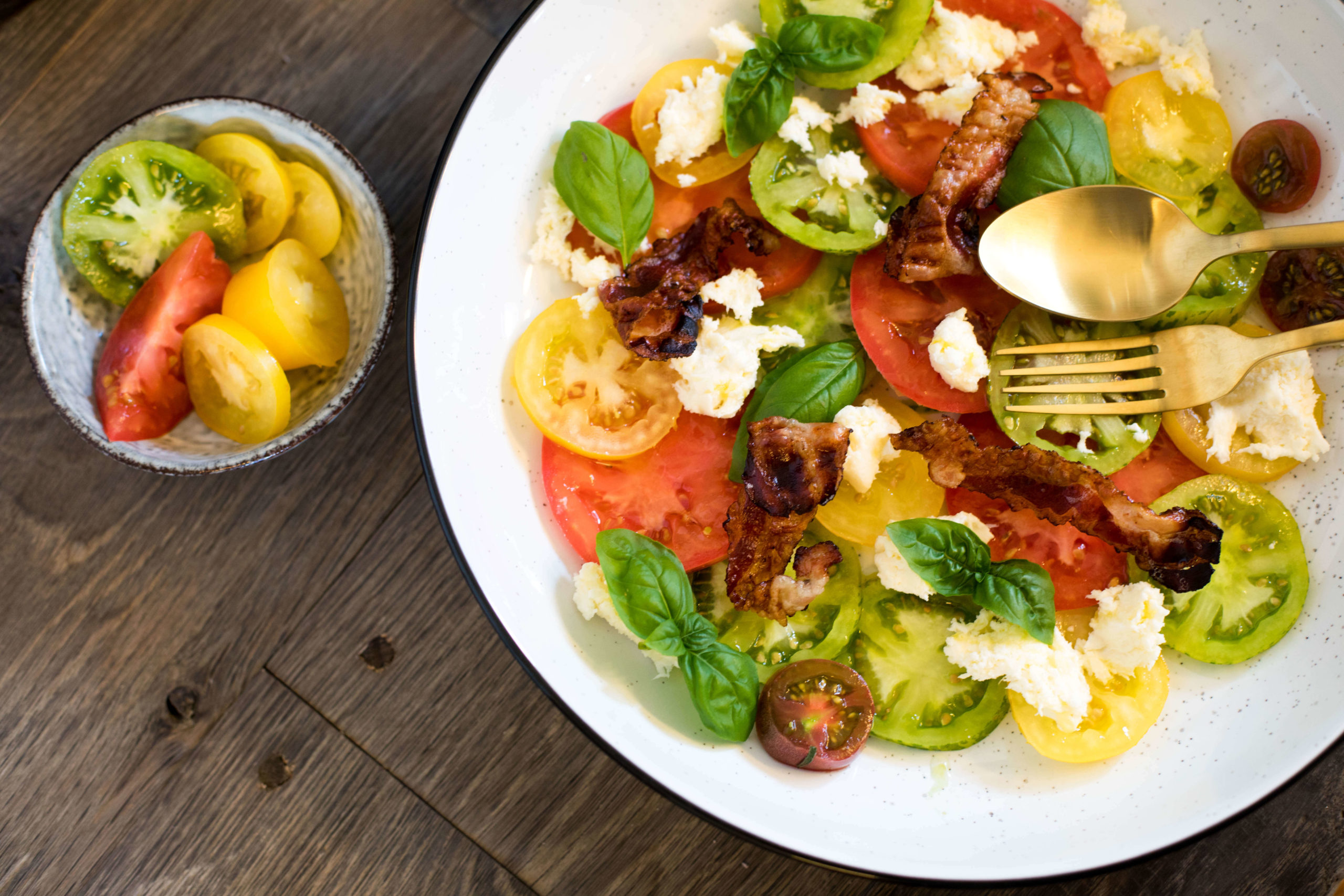 Die Tomaten in dünne Scheiben schneiden und auflegen. Den Mozzarella rupfen und darüber verteilen. Mit Öl, Salz, Pfeffer und Essig marinieren. Den Speck scharf anbraten und auf Küchenpapier abtropfen lassen. Mit Basilikum und Speck garnieren.